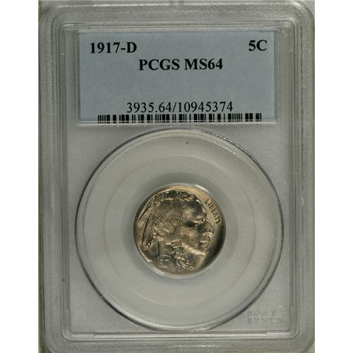 <B>1917-D 5C MS64 PCGS.</B></I> Choice with a trace of gold-gray iridescence and smooth, mercury-like surfaces. Typically struck with die erosion evident on each side.<BR><BR><b>Shipping:</b> Coin/Currency (<a target="_blank" href="http://www.heritageauctions.com/common/shipping.php">view shipping information</a>)