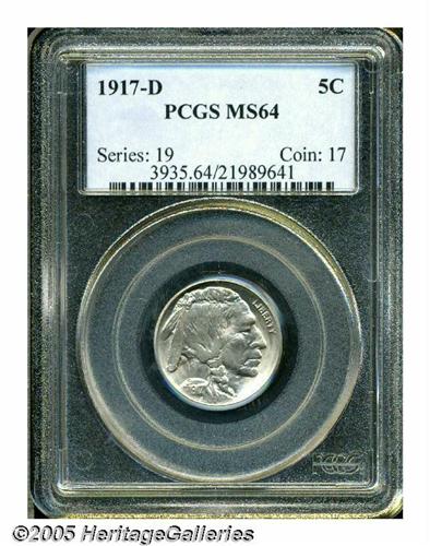 <B>1917-D<5C> MS64 PCGS.</B></I> Untoned and somewhat softly struck on the reverse, this early date Buffalo Nickel reveals satin luster over the carefully preserved surfaces. A minor blemish extending through the bison's horn is the only post-strike anomaly on either side of the coin. Population: 240 in 64, 116 finer (6/05).