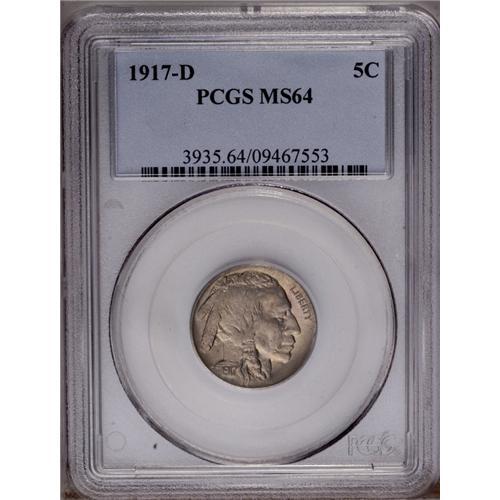 <B>1917-D<5C> MS64 PCGS.</B></I> Very sharply struck, especially for an example of this Denver Mint issue. For example, LIBERTY is fully separated from the rim, and the bison is sharply defined. Faint champagne toning is present on both sides. Slightly muted luster keeps this example from a higher grade.