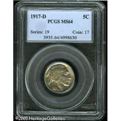 <B>1917-D 5C MS64 PCGS.</B></I> With traces of russet patina, this near-Gem Buffalo has brilliant luster, a sharp strike, and few contact marks. Lot:5969