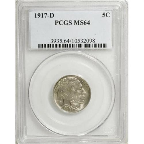 <B>1917-D 5C MS64 PCGS.</B></I> Well-defined at the margins, though the centers show a measure of softness, as is usual for this wartime Denver issue. Delicate gold and violet tints visit pleasingly preserved, subtly lustrous surfaces.<BR><BR><B>Coin Engraver:</B> James E. Fraser<BR><BR><b>Shipping:</b> Coins & Currency (<a target="_blank" href="http://www.heritageauctions.com/common/shipping.php">view shipping information</a>)