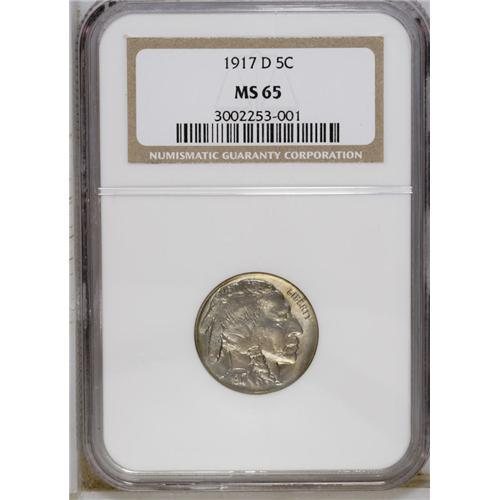 <B>1917-D 5C MS65 NGC.</B></I> This Gem Buffalo nickel shows a few indications of isolated striking weakness, but is certainly more boldly detailed than many of its counterparts from this poorly produced issue. Shining luster and multicolored pastel iridescence near the peripheries elevates the eye appeal of the piece. Well preserved and free of distracting marks. Census: 34 in 65, 1 finer (11/06).<BR><BR><b>Shipping:</b> Coin/Currency (<a target="_blank" href="http://www.heritageauctions.com/common/shipping.php">view shipping information</a>)