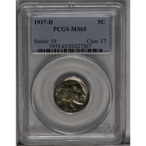 <B>1917-D<5C> MS65 PCGS.</B></I> Even though 9.9 million coins were struck of this issue, most of the surviving high grade examples display pronounced weakness of strike. This Gem, however, has a sharp mintmark and LIBERTY, and even the Indian's braid has decent detail. The surfaces are highly lustrous and each side is covered with subtle golden-rose toning that is very attractive. Refreshingly void of detectable marks. Population: 118 in 65, 12 finer (6/06).