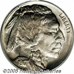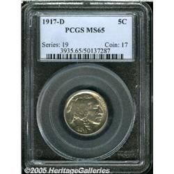<B>1917-D 5C MS65 PCGS.</B></I> Sharply struck, with especially strong definition on the obverse, the surfaces show a curious blend of both satiny and frosted mint luster that is often seen on this issue. Subtle silver-gray patina gently rests on each side. Population: 105 in 65, 12 finer (2/05).