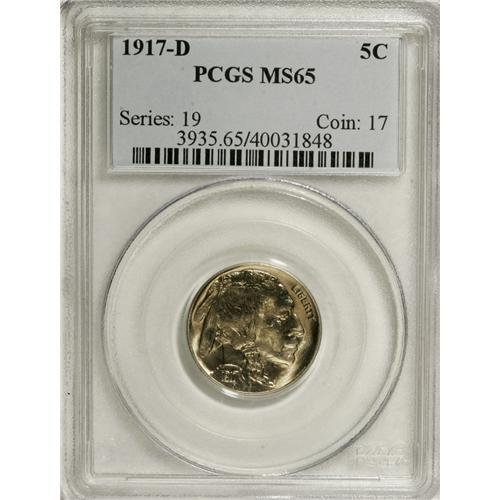 <B>1917-D 5C MS65 PCGS.</B></I> This early branch mint Gem has pleasing luster, and is lightly toned in almond-gold shades. Generally well struck, with slight softness on the bison's hair and on the outer curve of its tail. An interesting retained lamination (as produced) is noted on the bison's flank. As of (2/07), PCGS has certified just 12 pieces finer.<BR><BR><b>Shipping:</b> Coins & Currency (<a target="_blank" href="http://www.heritageauctions.com/common/shipping.php">view shipping information</a>)