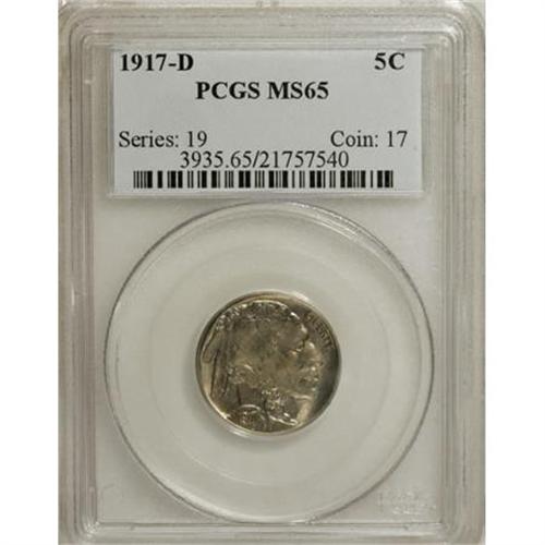 <B>1917-D 5C MS65 PCGS.</B></I> Struck from worn dies that were then polished, producing a bright, semi-reflective gleam in the fields. A bit softly defined on the hair above the Indian's braid, but well defined elsewhere. Lightly toned in shades of lilac and rose, each side is well balanced in appearance. This would make a nice addition to a collection of high grade Buffalo nickels.<BR><BR><B>Coin Engraver:</B> James E. Fraser<BR><BR><b>Shipping:</b> Coins & Currency (<a target="_blank" href="http://www.heritageauctions.com/common/shipping.php">view shipping information</a>\)