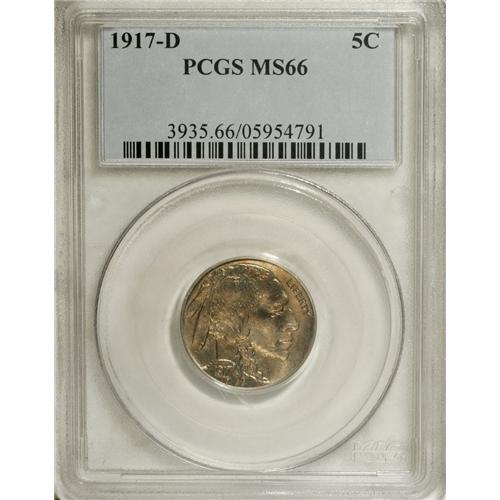 <B>1917-D 5C MS66 PCGS.</B></I> Both sides of this Premium Gem have satiny surfaces with brilliant luster beneath pleasing light gold toning. Although a hint of weakness is evident on parts of the bison, the overall strike is exceptional for this issue. For example, the date and LIBERTY both seem to jump off the surrounding field. The surfaces are pristine with only a few small flecks on the reverse. This impressive representative is tied for the finest certified by PCGS, and similarly, NGC has never seen a finer grade example. Population: 13 in 66, 0 finer (3/07).<BR><BR><b>Shipping:</b> Coins & Currency (<a target="_blank" href="http://www.heritageauctions.com/common/shipping.php">view shipping information</a>)