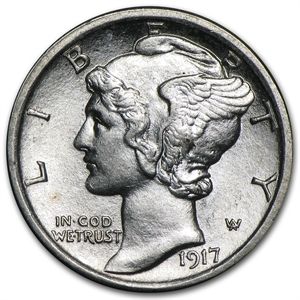 1917-D Brilliant Uncirculated - Full Split Bands - Merc **|**|** Year: 1917 ; Mint Mark: Brilliant Uncirculated ; Grade: D - Denver ; Denomination: 0.1 ; MSRP: $600