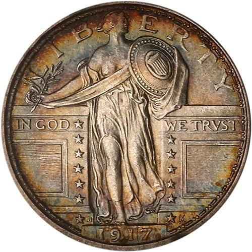 Nicely struck, almost a full head, silver with gold and blue near the rims. A nice coin, high grade coin with great eye appeal. Bids $700 and trends near $1000.