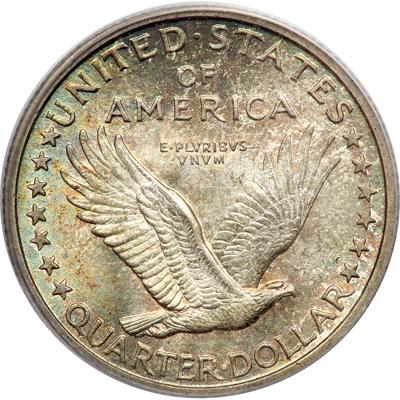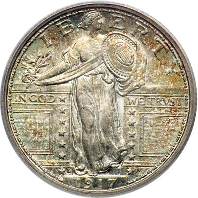 1917-D Liberty Standing Quarter Dollar. Type 1. PCGS graded MS-66 Full Head. Lovely shades of blue and gold toning. Well struck. A highly lustrous Gem that has immaculately preserved surfaces. It is easy to see this Denver Mint piece was delivered a full, sharp blow by the dies. Slap yourself on the back if you are the successful bidder on this handsome Type 1 Standing Liberty quarter dollar, for you walk away with one of the most elegant coin designs of them all, and in tip top condition. Pop 98; 17 finer in 67. (PCGS # 5709).