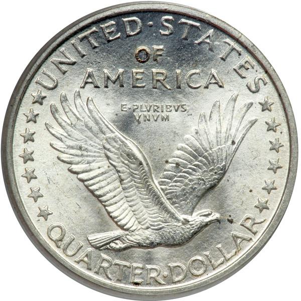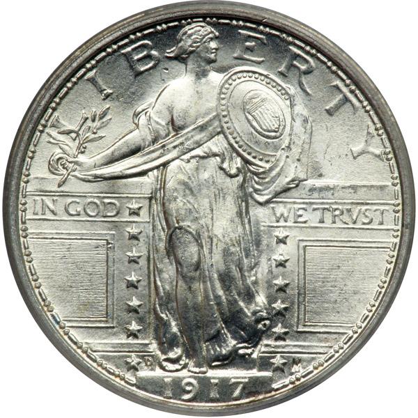1917-D. Type 1. PCGS graded MS-65 Full Head CAC Approved. Nice bold strike and totally white. In an OGH. You may recollect that, when you first started collecting coins, you came across photographs of the lovely Type 1 Standing Liberty quarter design. But little did you realize then how truly impressive these are when seen first-hand, not simply in a photograph. The present specimen is likely an early strike from fresh dies, judging from the details. The surfaces are satin silver. Pop 261; 133 finer (PCGS # 5709) .
