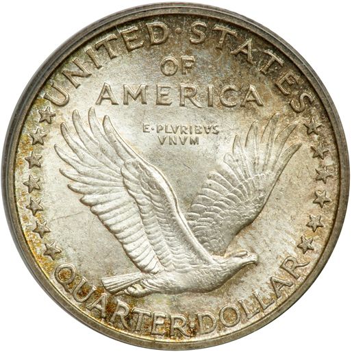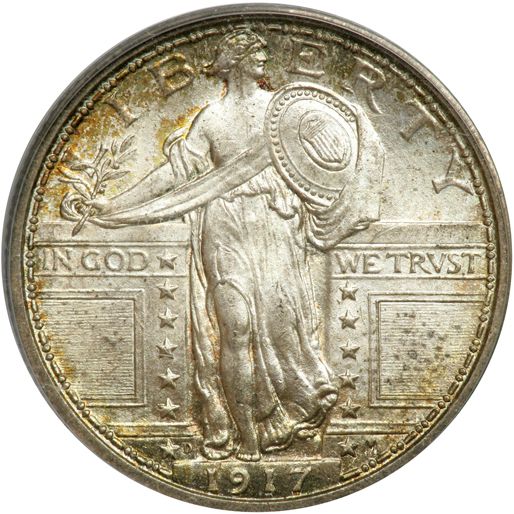 1917-D Liberty Standing Quarter Dollar. Type 1. PCGS graded MS-66 Full Head. Housed in an Old Green Holder. Nice original toning. Superb mint frostiness throughout. Type 1 and Type 2 Standing Liberty Quarters carry a funny, yet thought-provoking story. In the early years of this century a band of vice crusaders stalked the land. America, like most countries, had its history of swings from relatively "loose" morals to more prudish ones. After the infamous reformer, Anthony Comstock, passed on to a higher calling in 1915, his devoted followers continued the crusade. The day Hermon MacNeil brought out his aesthetically pleasing Standing Liberty motif in 1916 was the day a great hue and cry arose from these Comstockers. For what did they espy in his design but a bare-bosomed Ms. Liberty. Forget the fact that countless nations had their own splendid, if unclothed, artwork that had drawn rave reviews from art historians and critics; no, this new topless Quarter had to go! One can imagine Mr. MacNeil's chagrin at being told to modify the offending bosom. Thus arose the so-called Type 2 design. Not only did the artist comply with the Mint official's request, but he went overboard by draping poor Liberty in a highly encumbering chain-mail blouse! Be that as it may, here is a splendid representative Type 1 (bare-breasted) for your appreciation. Pop 115; 21 finer, 3 in 66+, 17 in 67, 1 in 67+ (PCGS # 5709) .