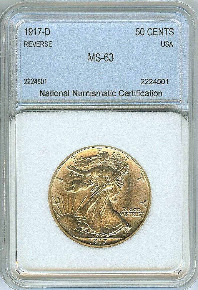 1917-D WALKING LIBERTY SILVER 50 CENTS WITH REVERSE MINT MARK NNC MS-63