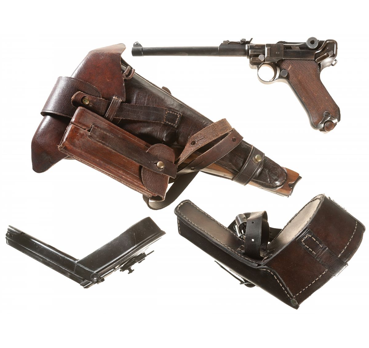 With shoulder stock, holster, 2 extra standard magazines, takedown tool, cleaning rod, 1 Luger snail drum magazine and a Luger snail drum magazine leather cover.