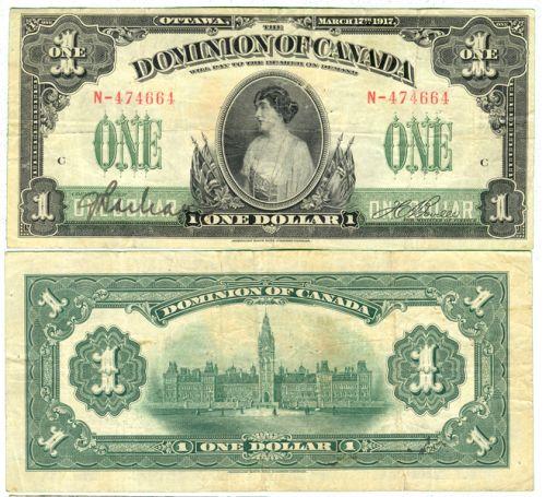 Very fresh well centered note. Vertical folds and pinholes with slight color soiling. Portrait design of HRH Princess Patricia, no seal variety serial #N-474664 with Boville signature. Cat #DC-23a-ii.