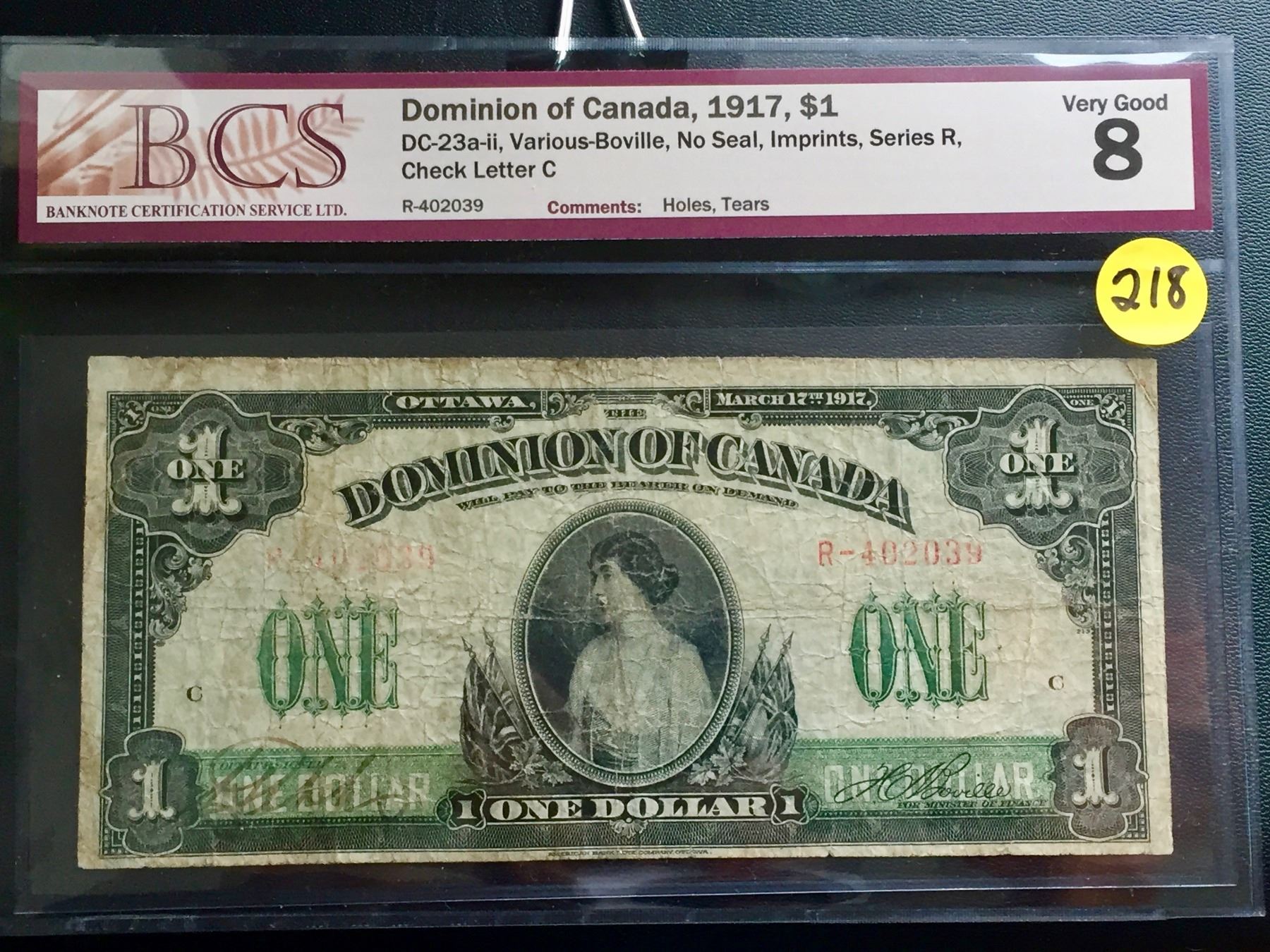 1917 Dominion of Canada $1 bill (BCS VG 8) Various-Boville
