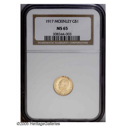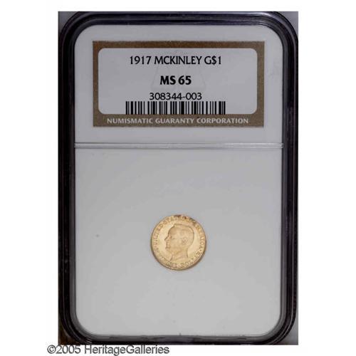 <B>1917<G$1> McKinley MS65 NGC.</B></I> Splendid satiny luster with pinkish-gold surfaces and a hint of prooflike reflectivity. Some grayish debris is trapped inside the holder but not affixed to the surface of the coin.<BR><I>From The Lexington Collection.</B></I>