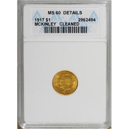 <B>1917 G$1 McKinley--Cleaned--ANACS. MS60 Details.</B></I> NGC Census: (4/1154). PCGS Population (8/2331). Mintage: 10,000. Numismedia Wsl. Price for NGC/PCGS coin in MS60: $610. (#7455)<BR><BR><b>Shipping:</b> Coins & Currency (<a target="_blank" href="http://www.heritageauctions.com/common/shipping.php">view shipping information</a>)