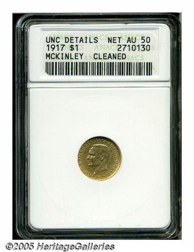 <B>1917<G$1> McKinley--Cleaned--ANACS. Unc Details, Net AU50.</B></I> A satiny peach-gold example, crisply struck and attractive despite slight haze in the fields.