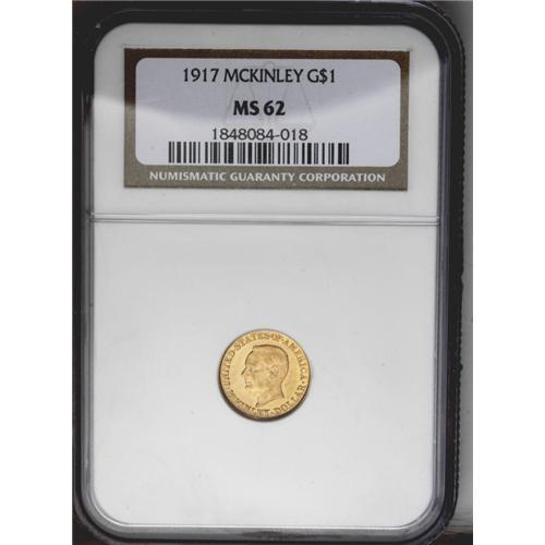 <B>1917<G$1> McKinley MS62 NGC.</B></I> A suitably lustrous example of the scarcer McKinley gold dollar. Most details on the building are fully struck. Hidden marks in the field limit the grade.<BR><I>From The Redfjord Collection.</B></I>