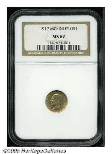 <B>1917<G$1> McKinley MS62 NGC.</B></I> Bright, semi-reflective fields and rich orange-gold coloration characterize this scarcer of the two variants of the McKinley gold dollar.