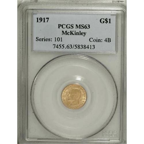 <B>1917 G$1 McKinley MS63 PCGS.</B></I> The shining surfaces are predominantly straw-gold with delicate hints of green. Well struck and appealing, though a number of faint abrasions are present on and near McKinley's portrait.<BR><I>From The Sterling Collection.</B></I><BR><BR><b>Shipping:</b> Coins & Currency (<a target="_blank" href="http://www.heritageauctions.com/common/shipping.php">view shipping information</a>)
