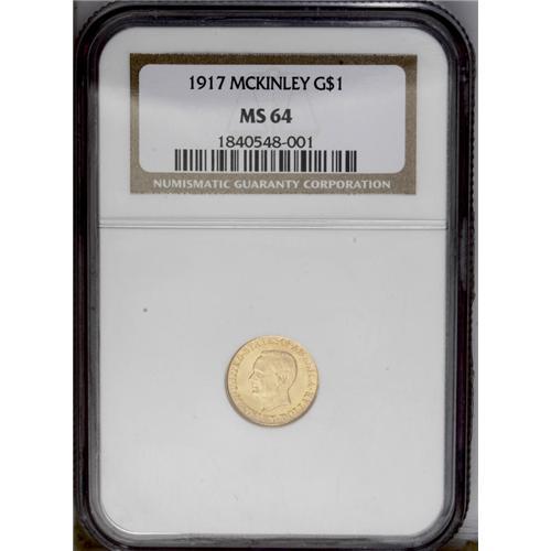 <B>1917<G$1> McKinley MS64 NGC.</B></I> Quite frosty with attractive lemon-yellow peripheral accents. A subtle wavy appearance about the portrait is the result of die clashing.