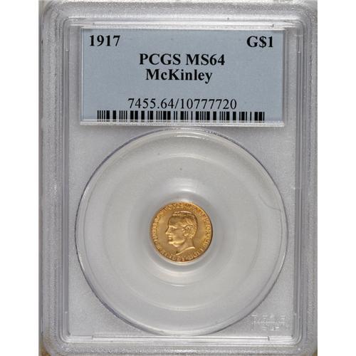 <B>1917 G$1 McKinley MS64 PCGS.</B></I> Well struck with pleasing mustard-gold color and highly reflective, semi-prooflike fields on each side. Both sides are blemish-free, but show a few wispy hairlines that preclude a higher grade.<BR><BR><b>Shipping:</b> Coins & Currency (<a target="_blank" href="http://www.heritageauctions.com/common/shipping.php">view shipping information</a>)