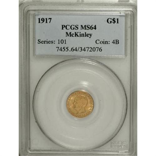 <B>1917 G$1 McKinley MS64 PCGS.</B></I> Of the 30,000 1916- and 1917-dated McKinley gold dollars produced for distribution, about 20,000 were sold. The remaining coins, most believed to be 1917s, were melted. This near-Gem example reveals an attractive mix of apricot-gold, orange, and lime-green, and the design elements are well executed. A few trivial ticks and slide marks are noted, as are a couple of minute greenish spots on the reverse. <BR><BR><b>Shipping:</b> Coins & Currency (<a target="_blank" href="http://www.heritageauctions.com/common/shipping.php">view shipping information</a>)