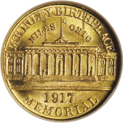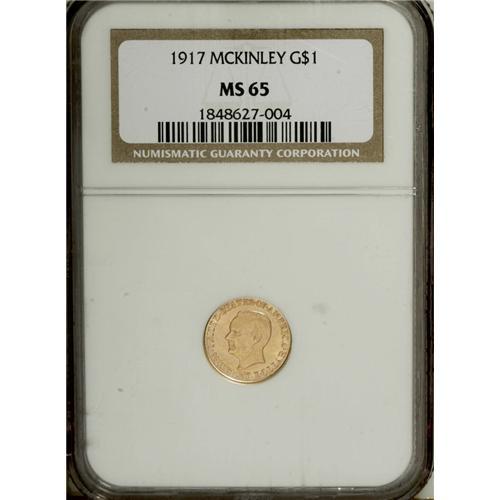 <B>1917 G$1 McKinley MS65 NGC.</B></I> The buttery-gold surfaces display crisply struck design features and pleasing satin luster. Distracting marks or blemishes are not found on either side of the coin. The McKinley commemorative gold dollars of 1916 and 1917 were intended to help defray the cost of constructing a McKinley birthplace memorial in the assassinated president's hometown of Niles, Ohio.<BR><BR><b>Shipping:</b> Coins & Currency (<a target="_blank" href="http://www.heritageauctions.com/common/shipping.php">view shipping information</a>)