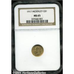 <B>1917<G$1> McKinley MS65 NGC.</B></I> This is a no-questions Gem whose reddish-gold surfaces are undeniably original. There are virtually no noticeable blemishes, and the luster is full and bright.<BR><I>From The Barry Donnell Collection, Part Two.</B></I> <BR><BR><B>Important notice:</B> Heritage usually auctions material at the rate of 200-250 lots per hour. On some occasions eBay Live bid software or the Internet may not be able to keep up with the pace of the auction. We recommend placing a realistic absentee bid now as insurance to avoid disappointment. Occasionally the auctioneer may eliminate or reject an eBay Live bid, and the auctioneer may also reopen a lot after the close of the eBay live bidding (usually because we missed an audience bid), and may reject your bid even if it shows you as the winning bidder. By bidding via eBay Live, you agree that Heritage may award the lot to another bidder at its sole discretion under the circumstances described above or any other reasonable circumstances. Since eBay bids are not shown to us until we open the lot on the floor, we treat those bids just like floor bids. In most cases the floor responds before the eBay bid is presented to us, due to Internet lag time, so for consistency we have made it a policy that floor bids are always considered first over tie eBay live bids. Also please note that all Heritage lots purchased through eBay Live carry a 20% Buyer's Premium. Please make sure you read the Terms and Conditions before you bid. </span></font></tr></table></td></tr></table>