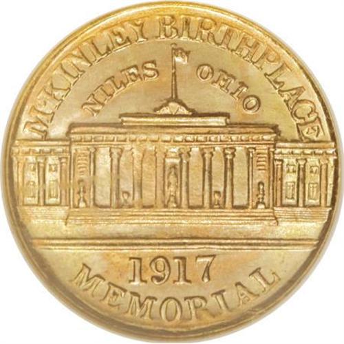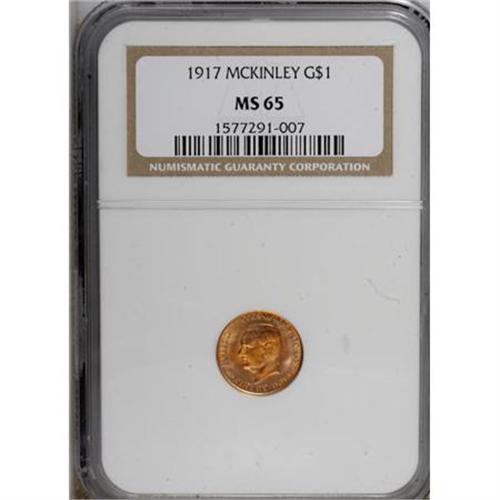 <B>1917 G$1 McKinley MS65 NGC.</B></I> The obverse of this carefully preserved commemorative gold dollar displays striking orange-gold and rose-gold coloration, while the reverse has a more muted appearance. Pleasingly detailed for this often-weak issue with strong luster. Both dates for the McKinley commemorative faced heavy melting, and attractive examples of the 1917 are particularly elusive.<BR><BR><b>Shipping:</b> Coins & Currency (<a target="_blank" href="http://www.heritageauctions.com/common/shipping.php">view shipping information</a>)