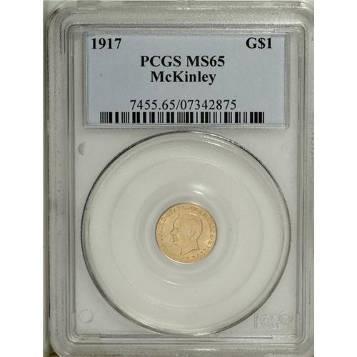 <B>1917 G$1 McKinley MS65 PCGS.</B></I> The shimmering surfaces of this McKinley gold dollar reveal faint accents of rose over the primary yellow-gold toning. Both sides of the coin are near-pristine, although a couple of faint slide marks are observed on McKinley's chin and jaw area, with the aid of high magnification.<BR><BR><b>Shipping:</b> Coin/Currency (<a target="_blank" href="http://www.heritageauctions.com/common/shipping.php">view shipping information</a>)
