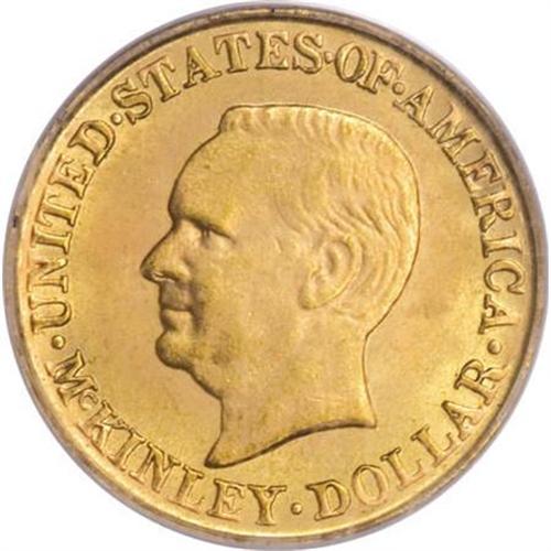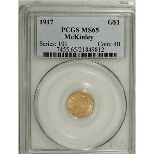 <B>1917 G$1 McKinley MS65 PCGS.</B></I> The original purpose of this two-year commemorative series was to raise funds for a birthplace memorial in Niles, Ohio, situated near the Pennsylvania border and northwest of Youngstown. This frosty and delightful Gem has yellow-gold surfaces with hints of light pink color. A touch of softness is present on the reverse, a typical feature for this issue.<BR><BR><b>Shipping:</b> Coins & Currency (<a target="_blank" href="http://www.heritageauctions.com/common/shipping.php">view shipping information</a>\)