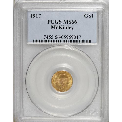 <B>1917 G$1 McKinley MS66 PCGS.</B></I> Attractive sea-green and rose toning increases the eye appeal of this lustrous and reasonably struck Premium Gem. Immaculate aside from a solitary, hair-thin mark on the left obverse field. Type collectors were satisfied with their 1916 McKinley dollar, which led to a lower net mintage for the 1917.<BR><BR><b>Shipping:</b> Coins & Currency (<a target="_blank" href="http://www.heritageauctions.com/common/shipping.php">view shipping information</a>)
