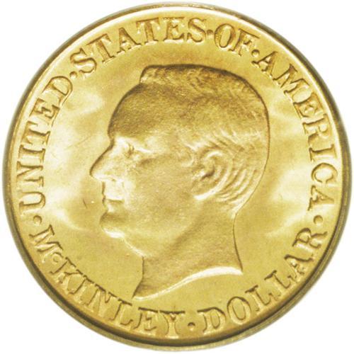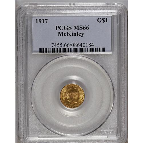 <B>1917<G$1> McKinley MS66 PCGS.</B></I> This attractive multicolored Premium Gem has good luster and a reasonable strike, with only some minor softness noted at the center of the reverse. A variegated mixture of olive-gold, lilac, red, and sky-blue colors decorates each side. Struck from slightly rotated dies.