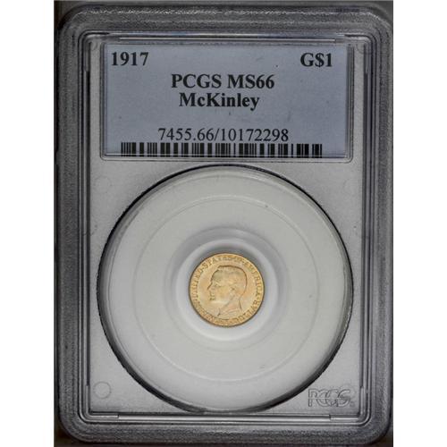 <B>1917<G$1> McKinley MS66 PCGS.</B></I> Visually enticing mint-green, tan, and terra cotta toning is the hallmark of this exquisitely preserved Premium Gem. Well struck, lustrous, and pristine on the reverse, with a few wispy nicks on the obverse that are only obvious under magnification. A beautiful example of this attractive commemorative design.
