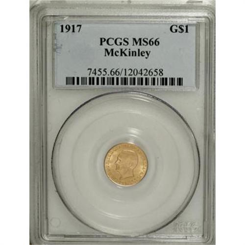 <B>1917 G$1 McKinley MS66 PCGS.</B></I> A gorgeous Premium Gem specimen with fully brilliant and frosty yellow-gold luster. The 1916 and 1917 McKinley gold dollars memorialized Niles, Ohio as the birthplace of the late President William McKinley, who was assassinated at the end of his term in office.<BR><BR><b>Shipping:</b> Coins & Currency (<a target="_blank" href="http://www.heritageauctions.com/common/shipping.php">view shipping information</a>)