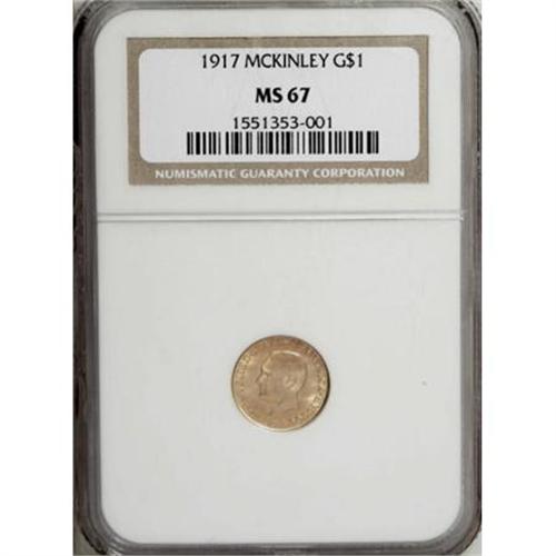 <B>1917 G$1 McKinley MS67 NGC.</B></I> This Superb Gem specimen of the elusive 1917 McKinley gold dollar is tied for the finest certified by either NGC or PCGS (7/07). Both sides of this piece have shimmering, frosty luster with a touch of satin that brings out the sharp design details. The obverse is bright yellow-gold, while the reverse has a blend of deeper yellow and honey-gold.<BR> Despite a mintage of just 10,000 pieces, the 1917 issue failed to sell out, just as the 1916 McKinley dollar had unsold remainders. While B. Max Mehl, numismatic huckster extraordinaire, purchased a sizable number of the pieces, an unknown quantity were melted at the Mint. Regardless of any contemporary indifference toward this commemorative issue, numismatists avidly seek examples today, and this delightful survivor could find a place in the finest of collections.<BR><BR><b>Shipping:</b> Coins & Currency (<a target="_blank" href="http://www.heritageauctions.com/common/shipping.php">view shipping information</a>\)