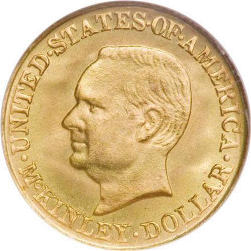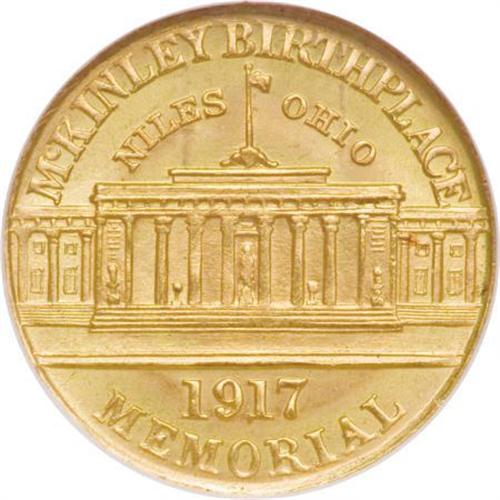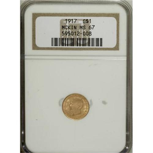 <B>1917 G$1 McKinley MS67 NGC.</B></I> The McKinley dollars of 1916 and 1917 were, in the words of Q. David Bowers (1991), "ostensibly issued for an altruistic purpose." Still, while the record shows poor design and marketing of the pieces, one detects none of the malice that tinged certain later commemorative issues, and the aforementioned "altruistic purpose," the construction of a birthplace memorial for the assassinated Ohioan, was fulfilled. The building, now part of a complex that includes a library, stands at 40 North Main Street in the town of Niles.<BR> Hints of frost visit the swirling luster of this well struck and slightly satiny representative. The surfaces, peach-gold with a hint of straw, are exquisitely preserved. Even under magnification, the fields border on unimprovable. A truly top-notch survivor, with no numerically finer pieces graded by either NGC or PCGS (10/07).<BR><I>From The Fleur Wales-Baillie Collection.</B></I><BR><BR><b>Shipping:</b> Coins & Currency (<a target="_blank" href="http://www.heritageauctions.com/common/shipping.php">view shipping information</a>)