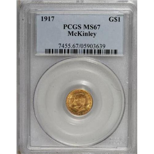 <B>1917 G$1 McKinley MS67 PCGS.</B></I> Despite disappointing sales for the 1916 McKinley dollars, the beneficiaries of the commemorative issue ordered further examples dated 1917. Afterward, neither date sold well, and only a bulk purchase of both dates by B. Max Mehl kept the two issues from being more elusive than they are. While scholars disagree on the eventual net mintage for the 1917 McKinley half, most believe that the issue has fewer extant pieces than its earlier 1916 counterpart.<BR> The apricot-gold and wheat surfaces of this shining Superb Gem exhibit delightful luster, and the devices offer surprisingly strong detail. Even under magnification, one has difficulty finding even trivial flaws on this exquisitely preserved coin. A wonderful representative in the best condition attainable; neither NGC nor PCGS has certified a numerically finer representative (9/07).<BR><BR><b>Shipping:</b> Coins & Currency (<a target="_blank" href="http://www.heritageauctions.com/common/shipping.php">view shipping information</a>)