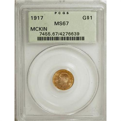 <B>1917 G$1 McKinley MS67 PCGS.</B></I> While some scholars have asserted that the 1916 and 1917 McKinley gold dollars exist in roughly equal quantities, they do not appear with the same frequency on the numismatic marketplace. Q. David Bowers (1991) suggests that only around 5,000 of the 1917-dated pieces escaped the melting pot, a figure that concurs with the 2008 <I>Guide Book</B></I>.<BR> The amazing Superb Gem offered here belongs to the highest tier of survivors. The obverse has vivid orange-gold at the margins surrounding delicate rose and lilac in the center, while the reverse shows similar, subtler coloration. Well struck for the issue with impressive luster and excellent overall preservation. A vibrant and eminently appealing masterpiece. Neither NGC nor PCGS has graded a numerically finer example (11/07).<BR><I>From The Pinetop Collection.</B></I><BR><BR><b>Shipping:</b> Coins & Currency (<a target="_blank" href="http://www.heritageauctions.com/common/shipping.php">view shipping information</a>)