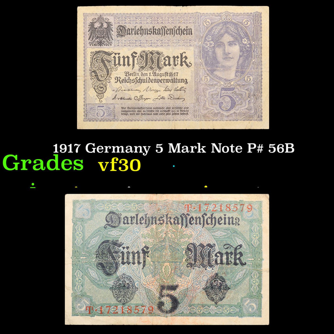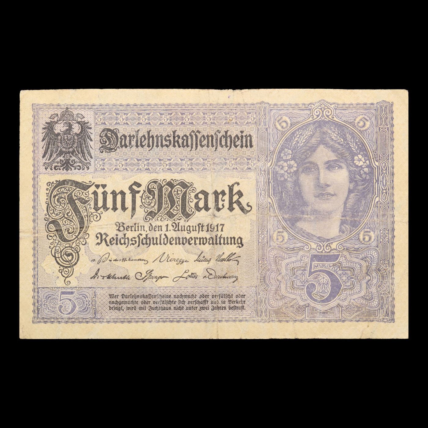 1917 Germany 5 Mark Note P# 56B Grades vf++.