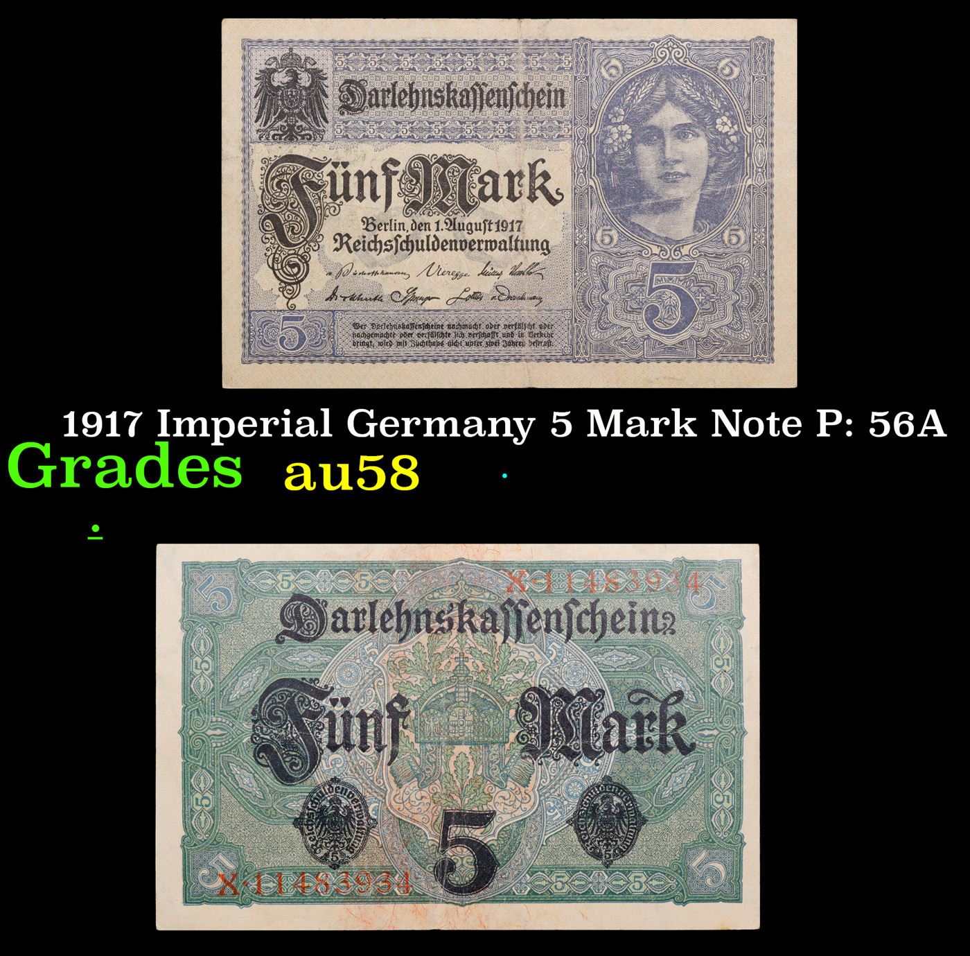 1917 Imperial Germany 5 Mark Note P: 56A Grades Choice AU/BU Slider.