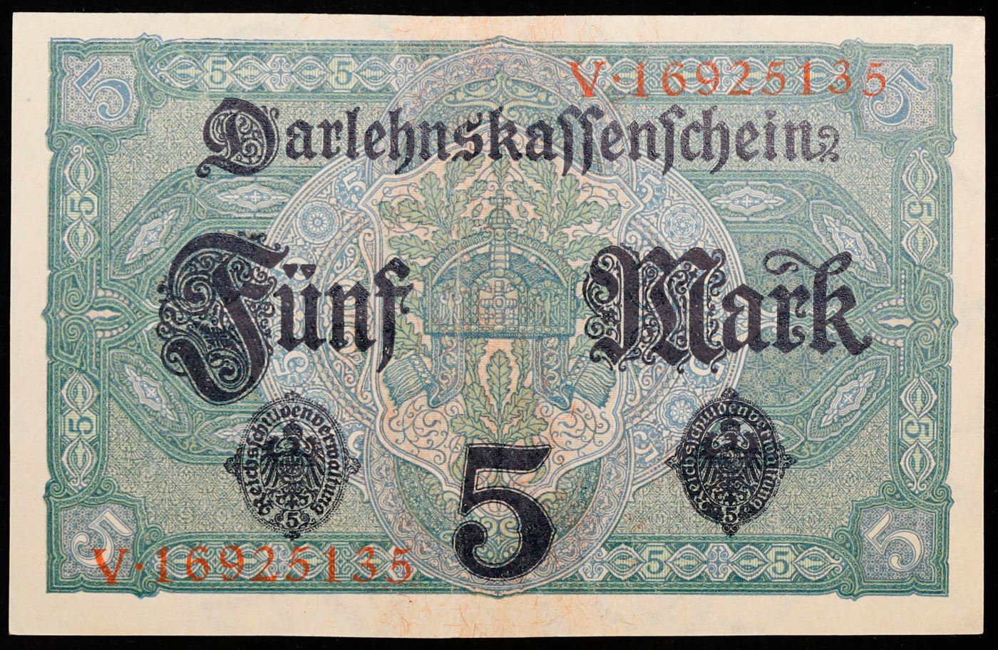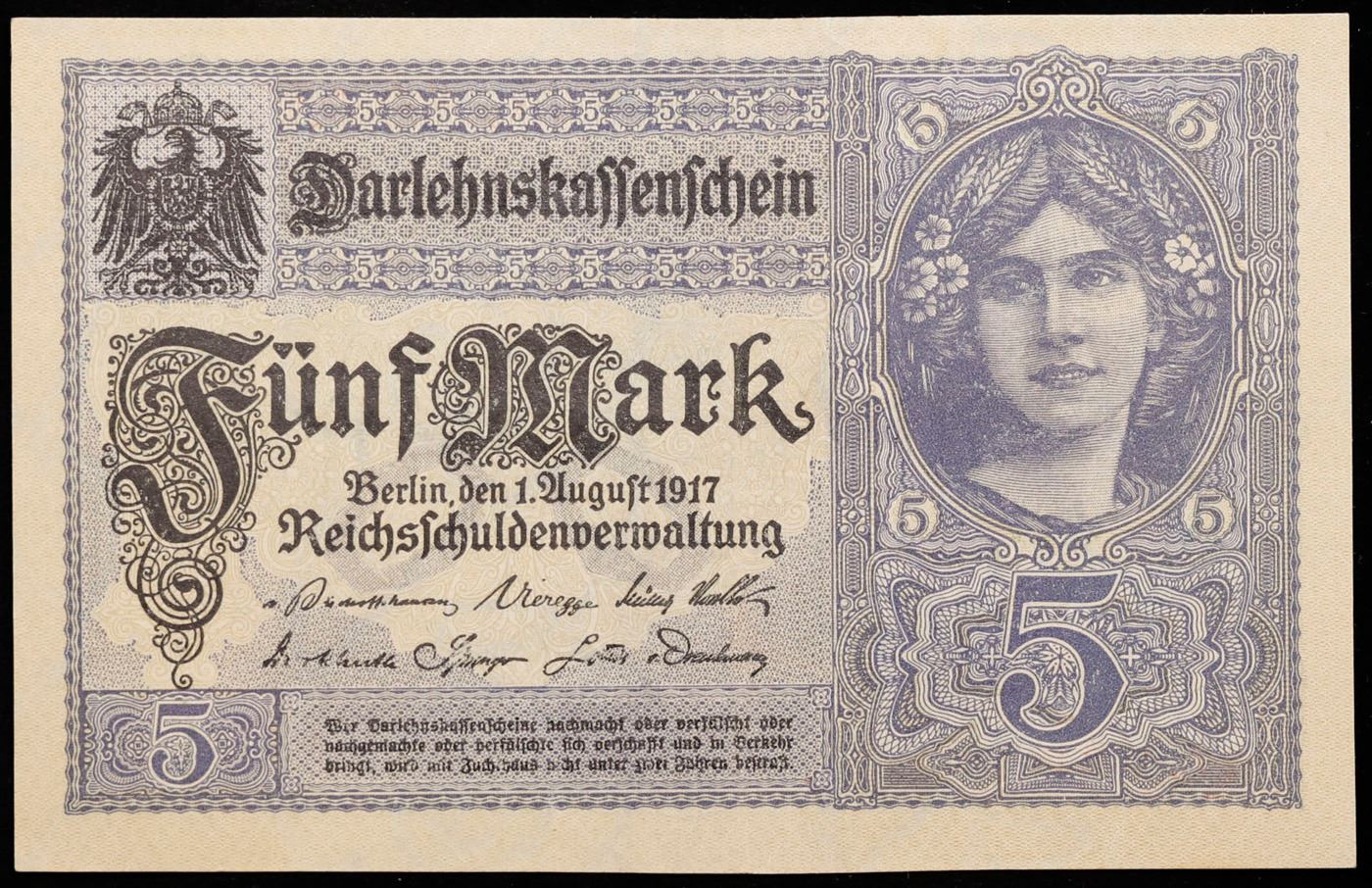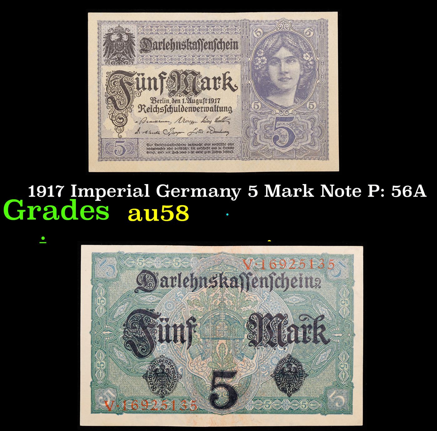 1917 Imperial Germany 5 Mark Note P: 56A Grades Choice AU/BU Slider.