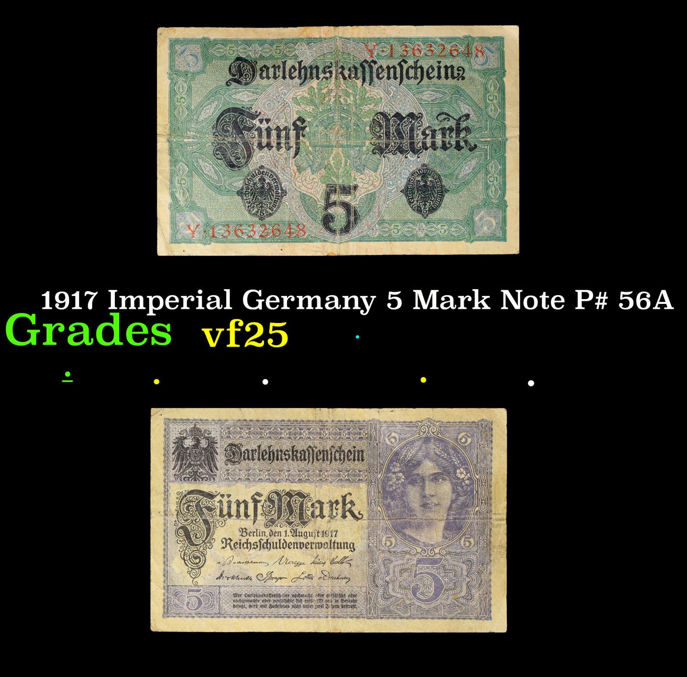 1917 Imperial Germany 5 Mark Note P# 56A Grades vf+. In August 1914, Directly after the onset of WW1, the German Empire removed the gold backing of the mark and issued new currency. After the fall of the German Empire in 1918, the newly formed German Weimar Republic issued another new currency, known derisively as the "Paper Mark", which faced massive hyperinflation.