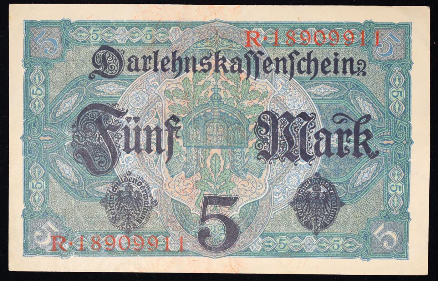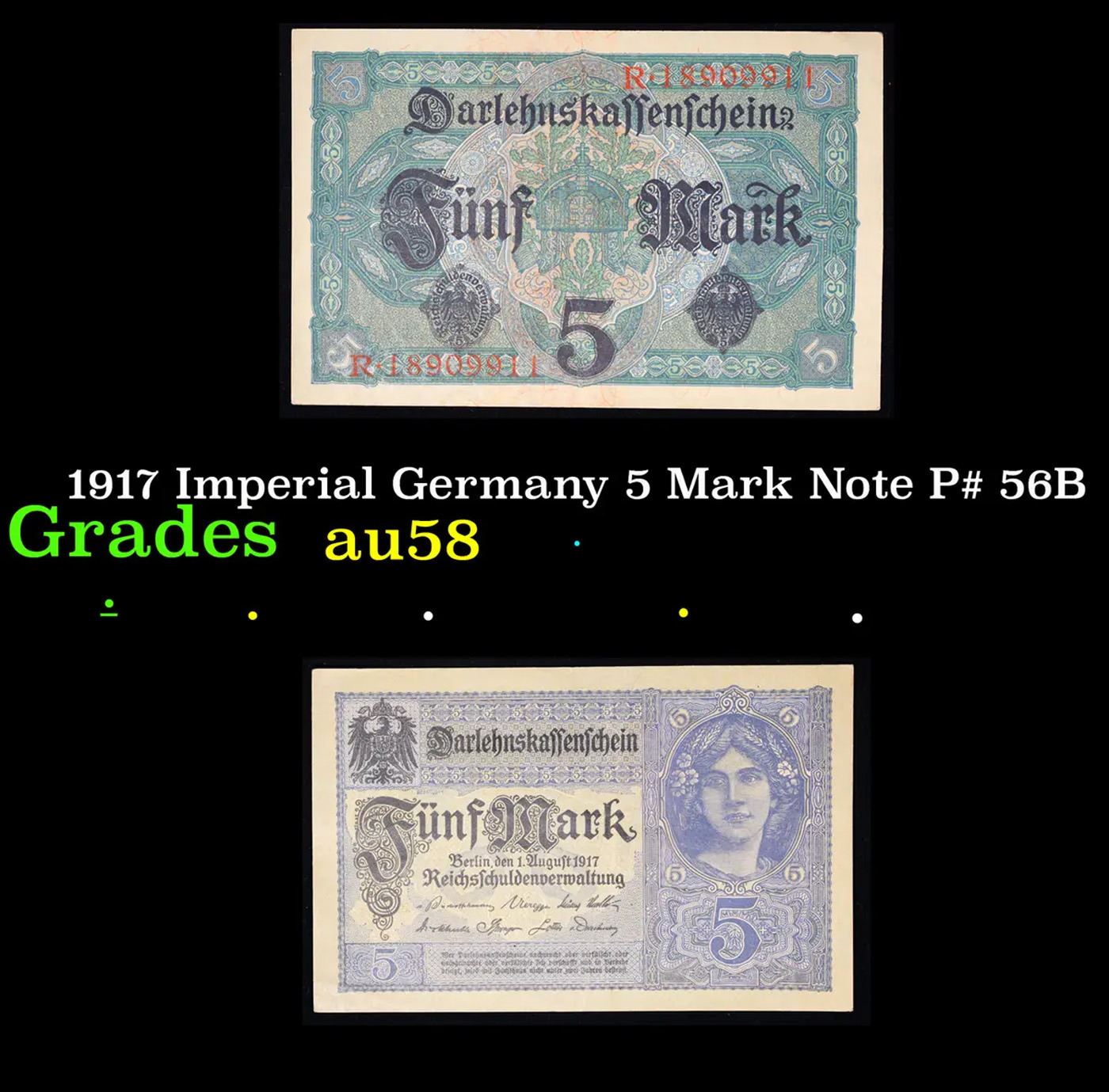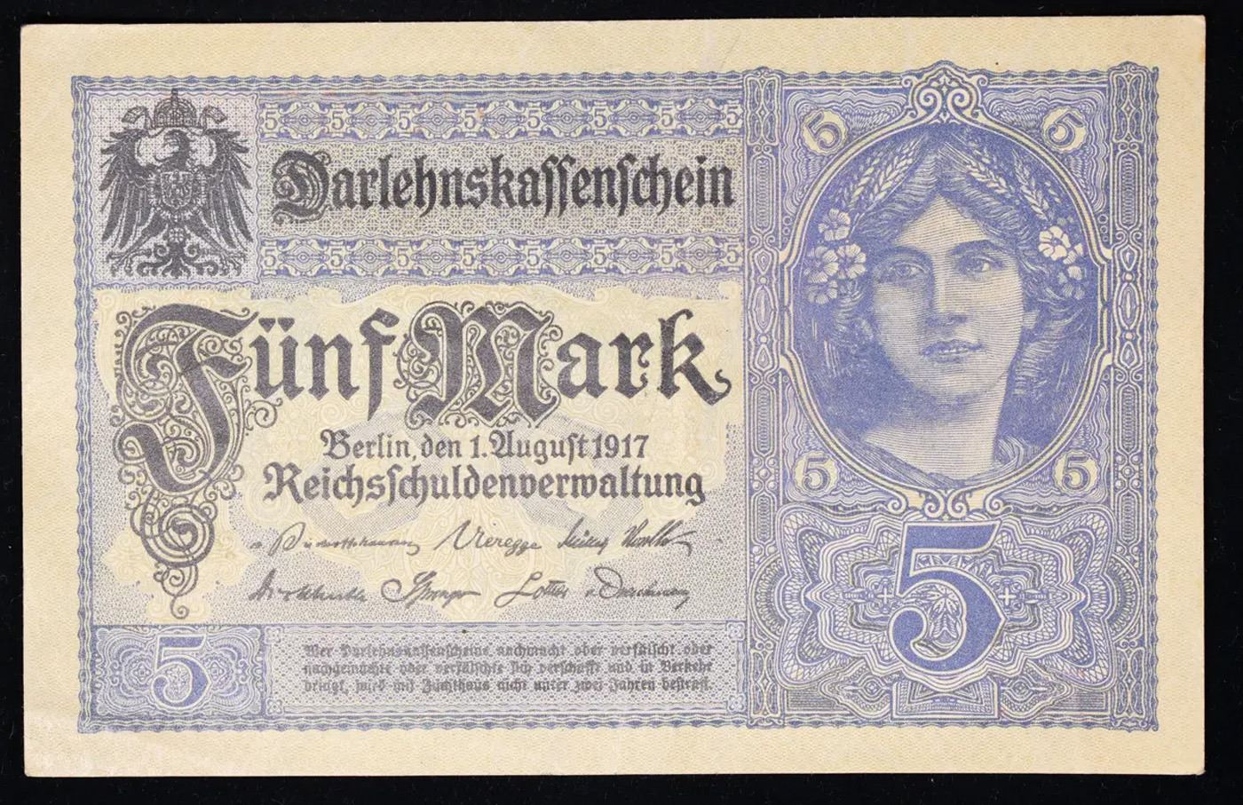 1917 Imperial Germany 5 Mark Note P# 56B Grades Choice AU/BU Slider. In August 1914, Directly after the onset of WW1, the German Empire removed the gold backing of the mark and issued new currency. After the fall of the German Empire in 1918, the newly formed German Weimar Republic issued another new currency, known derisively as the "Paper Mark", which faced massive hyperinflation.