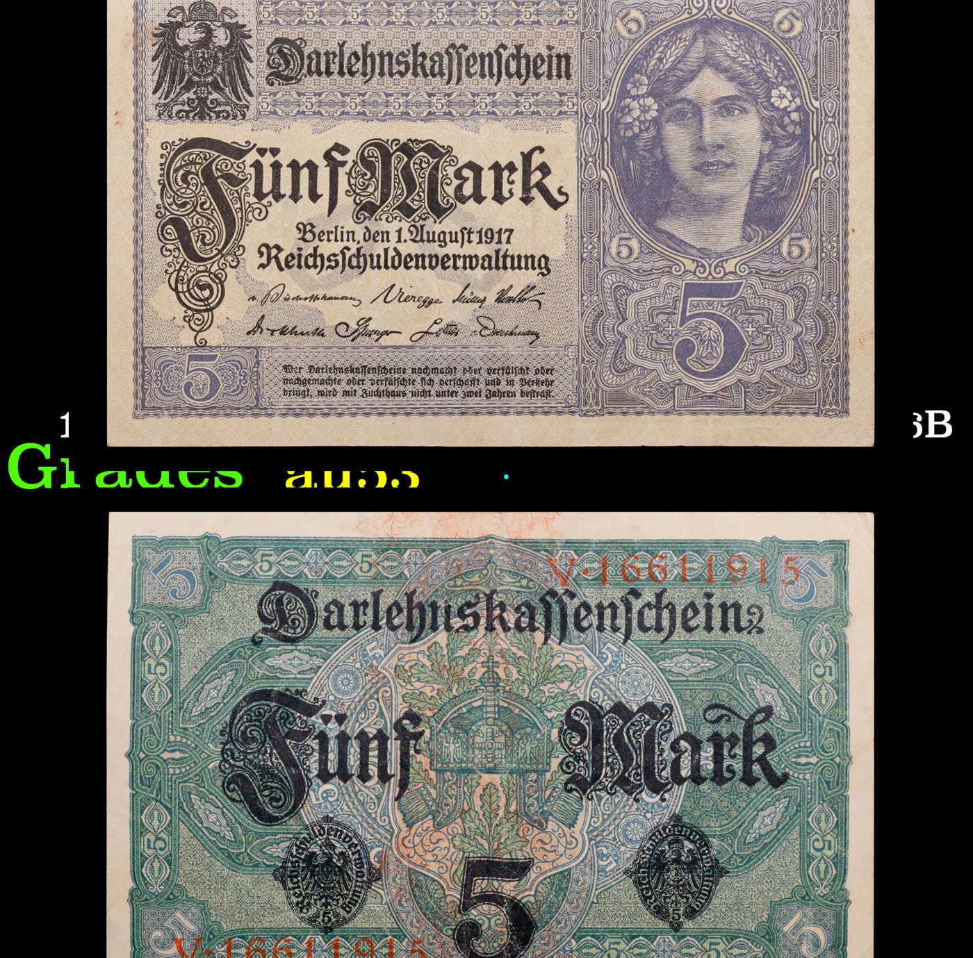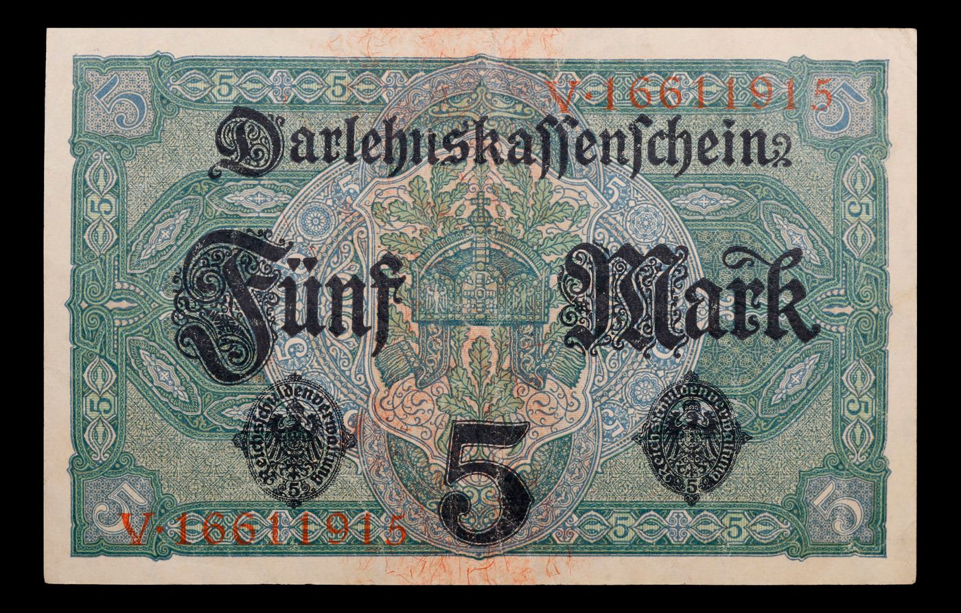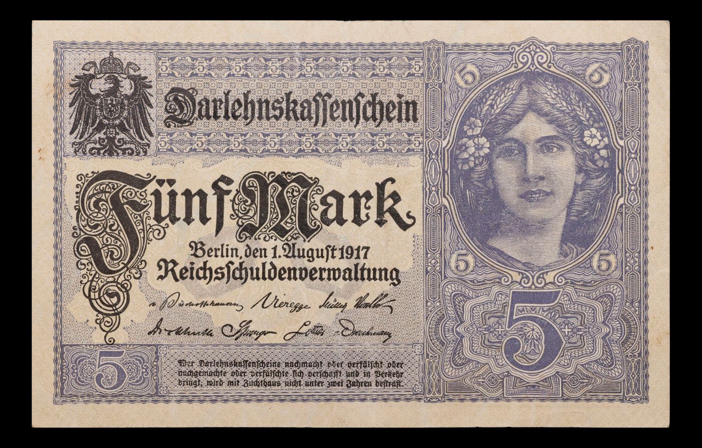 1917 Imperial Germany 5 Mark Note P# 56B Grades Select AU. In August 1914, Directly after the onset of WW1, the German Empire removed the gold backing of the mark and issued new currency. After the fall of the German Empire in 1918, the newly formed German Weimar Republic issued another new currency, known derisively as the "Paper Mark", which faced massive hyperinflation.
