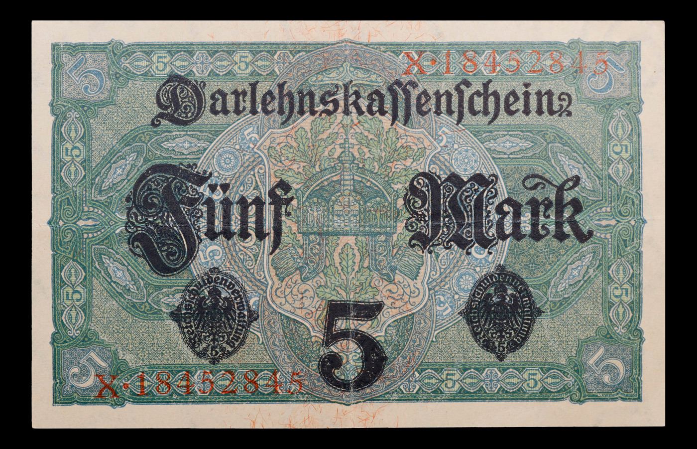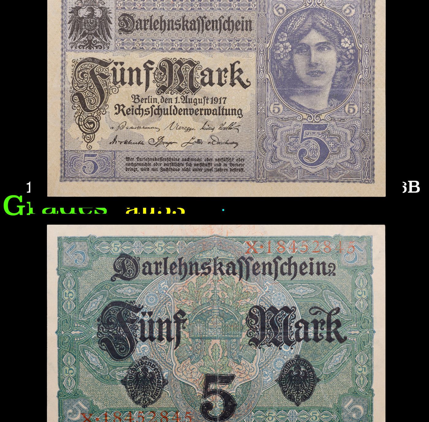 1917 Imperial Germany 5 Mark Note P# 56B Grades Select AU. In August 1914, Directly after the onset of WW1, the German Empire removed the gold backing of the mark and issued new currency. After the fall of the German Empire in 1918, the newly formed German Weimar Republic issued another new currency, known derisively as the "Paper Mark", which faced massive hyperinflation.