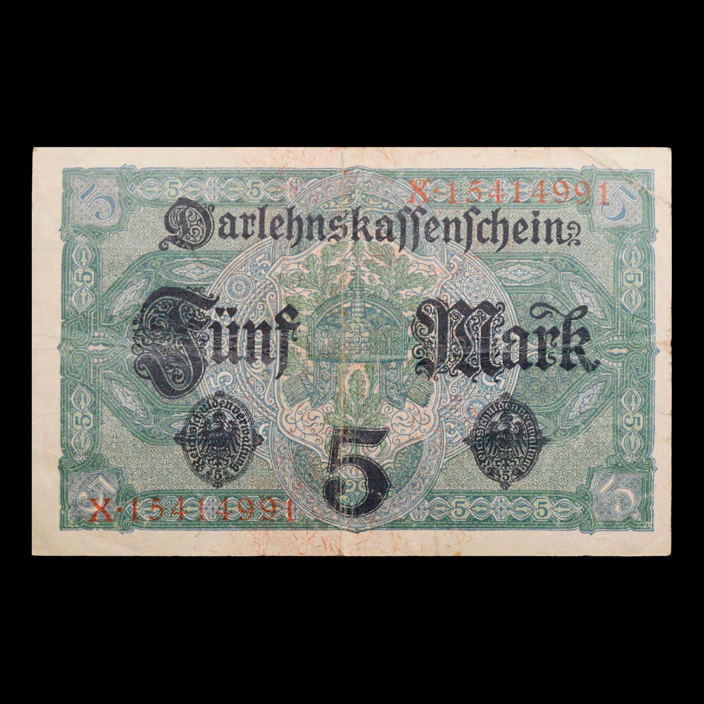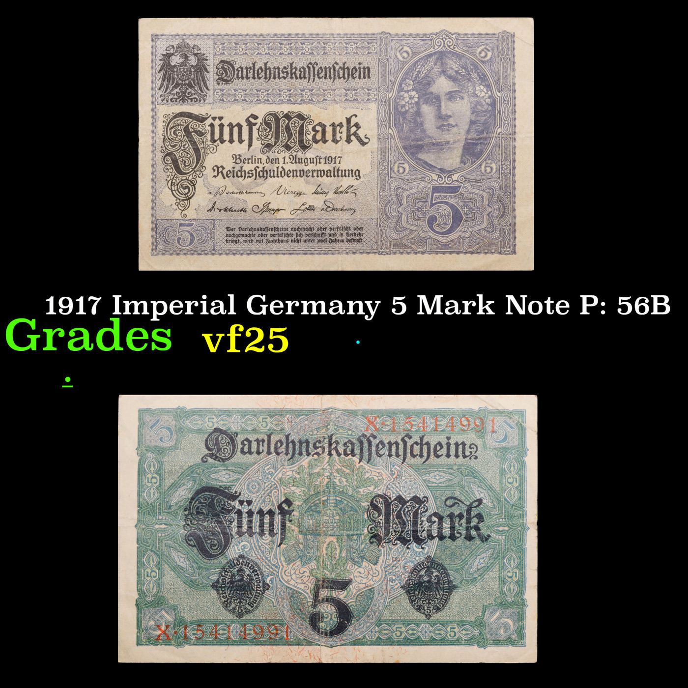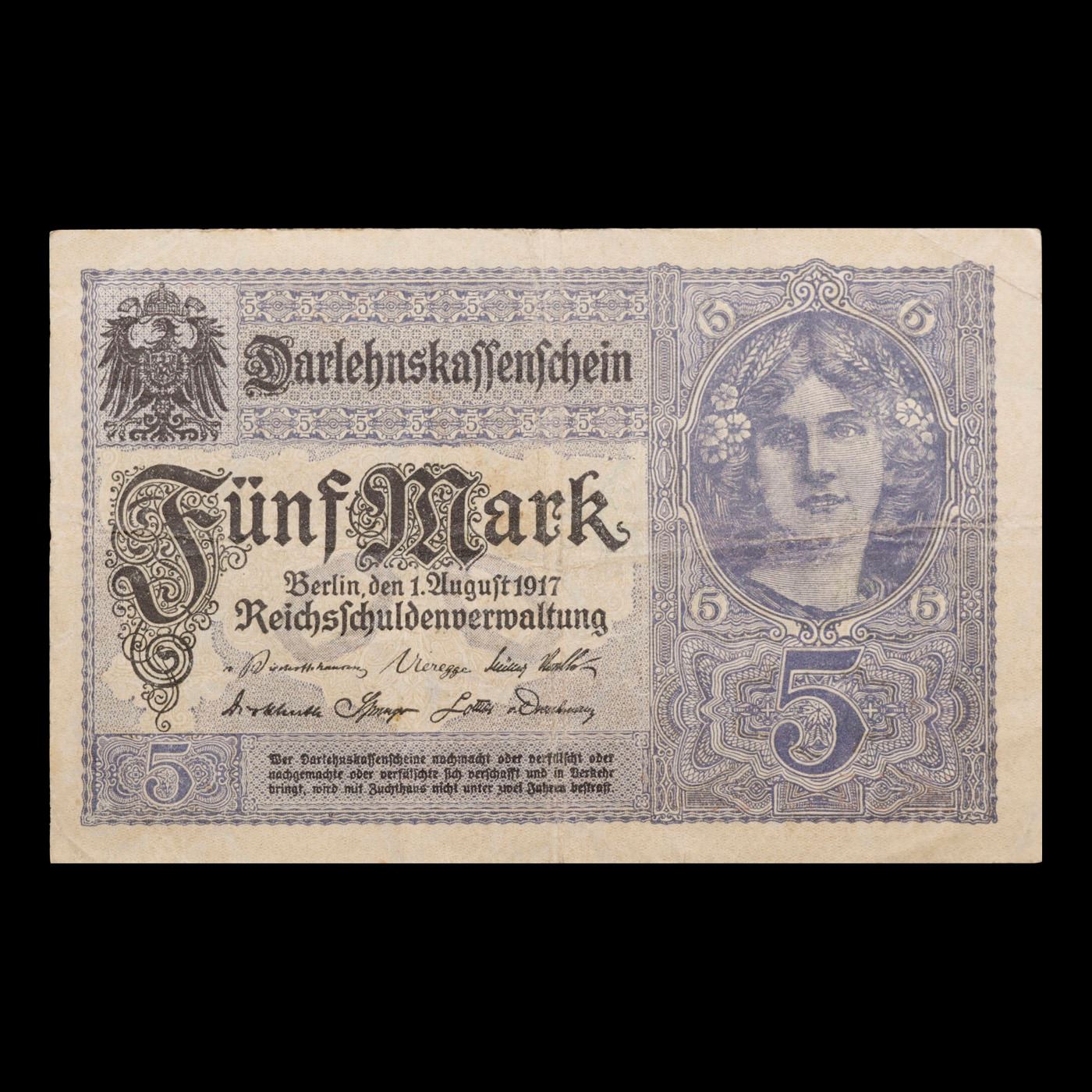 1917 Imperial Germany 5 Mark Note P: 56B Grades vf+. In August 1914, Directly after the onset of WW1, the German Empire removed the gold backing of the mark and issued new currency. After the fall of the German Empire in 1918, the newly formed German Weimar Republic issued another new currency, known derisively as the "Paper Mark", which faced massive hyperinflation.